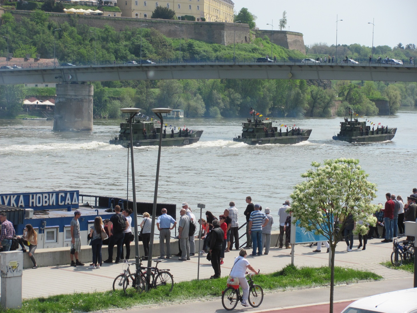 The second part of the ceremony was carried out on the Danube, where numerous observers watched the parade and the display of a part of the vessels, river multifunctional, patrol and landing ships and groups of inflatable boats from the composition the River Flotilla, decorated with flags for dressing, with traditional manning the rail shouting “Hurray!” that provoked applause of the present observers. It was for the first time, that ships were sailing under the new names of Novi Sad, Titel, Apatin, Bečej, Belegiš, Taraš, Kolubara, Morava and Timok. The parade was commanded by Commander Romeo Grbović, commander of the First River Detachment.