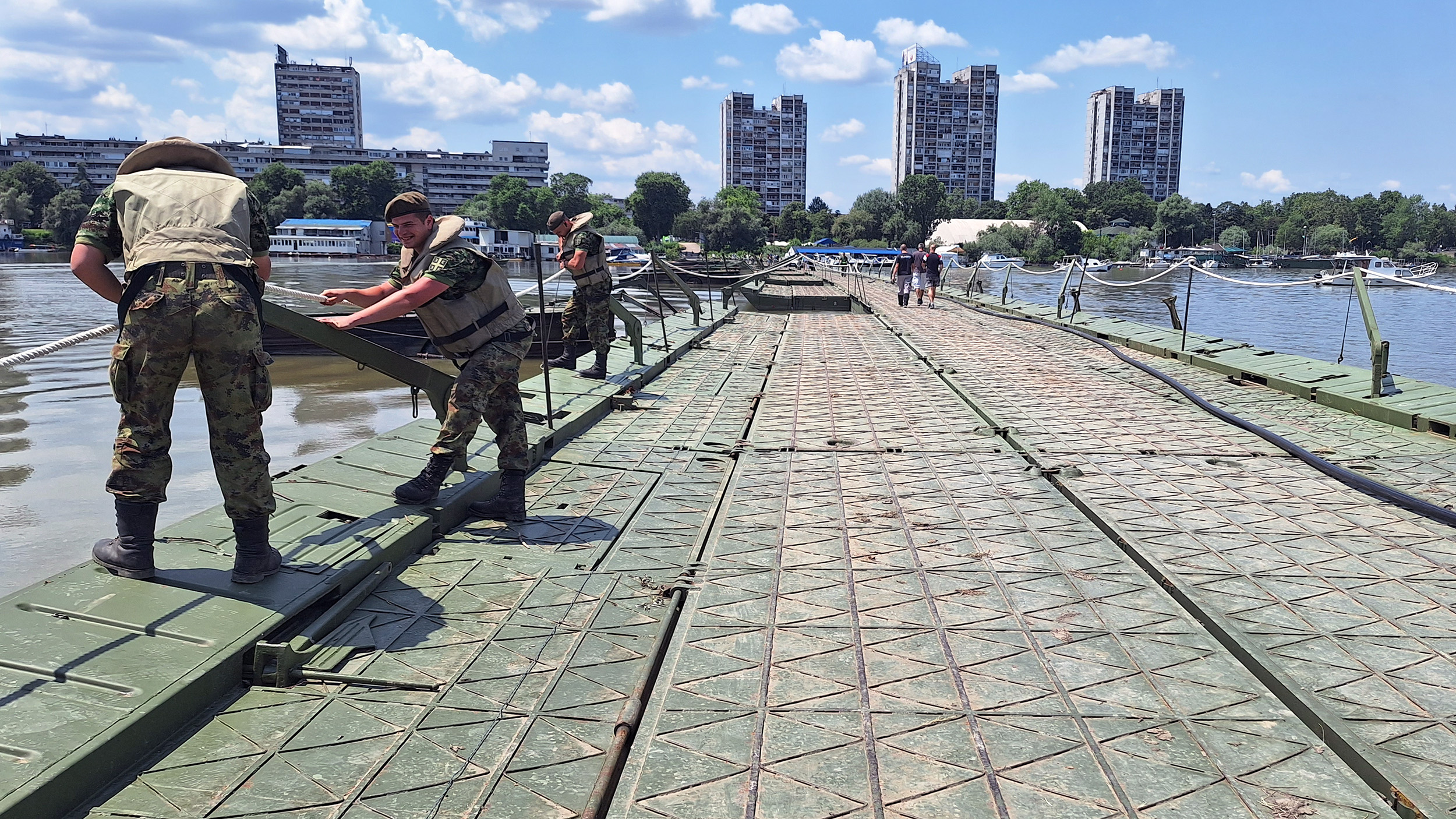 Припадници понтонирских јединица Војске Србије завршили су постављање понтонског моста преко Дунава, од Земунског кеја до Великог ратног острва, који ће омогућити грађанима Београда да и ово лето проведу на дунавској плажи Лидо.