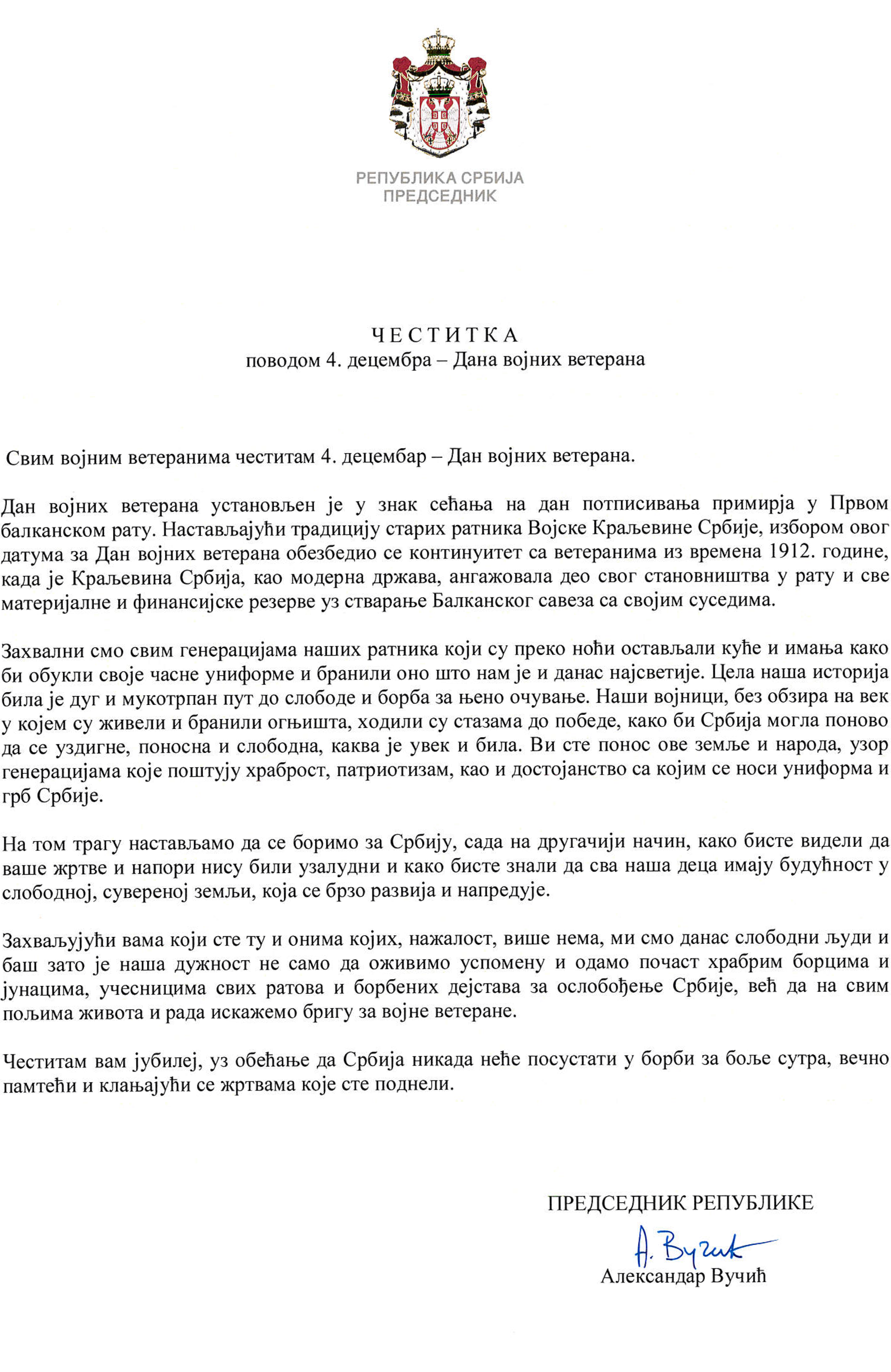 Честитка врховног команданта Војске Србије и председника Републике поводом Дана војних ветерана