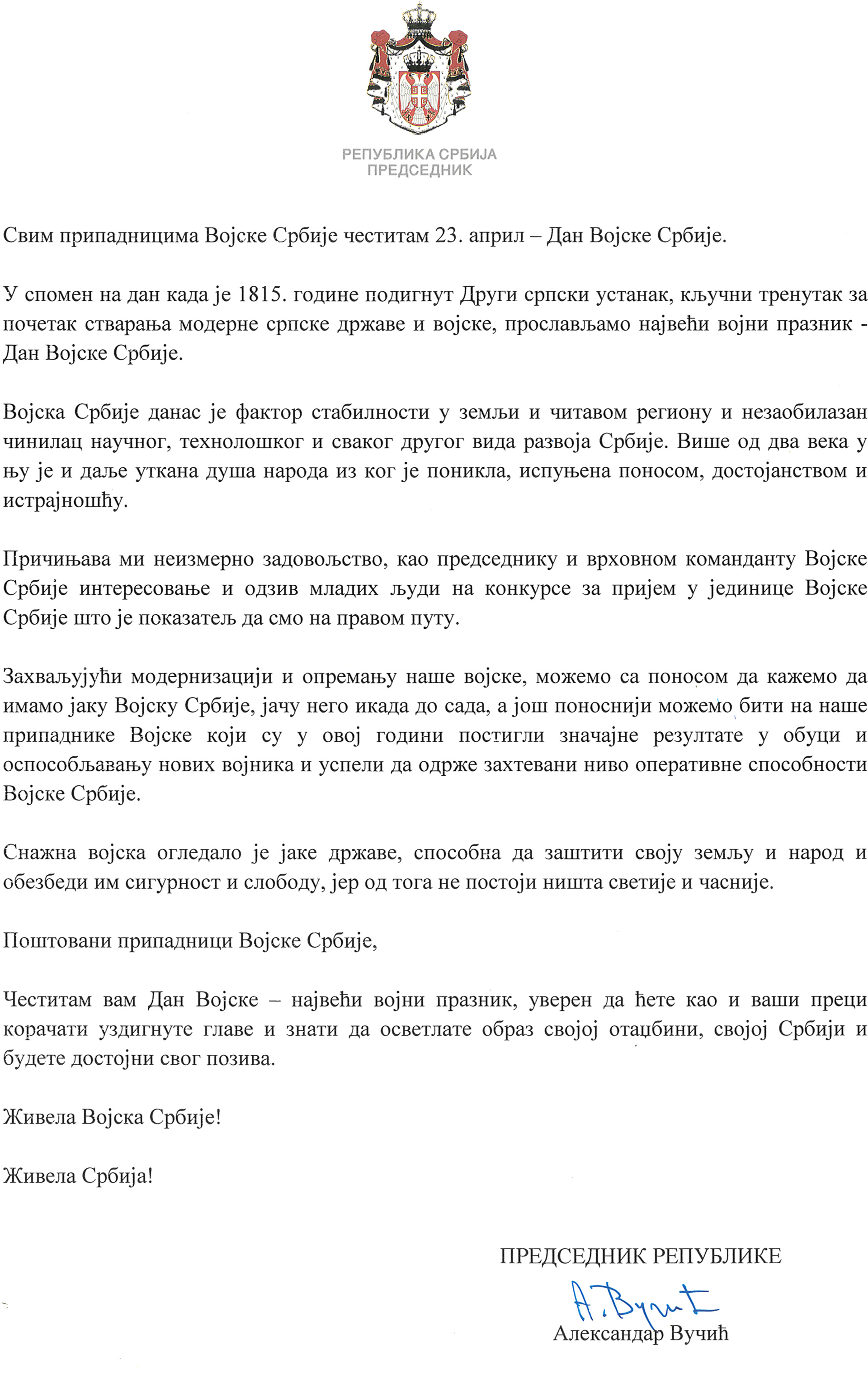 Честитка врховног команданта Војске Србије и председника Републике поводом Дана Војске Србије