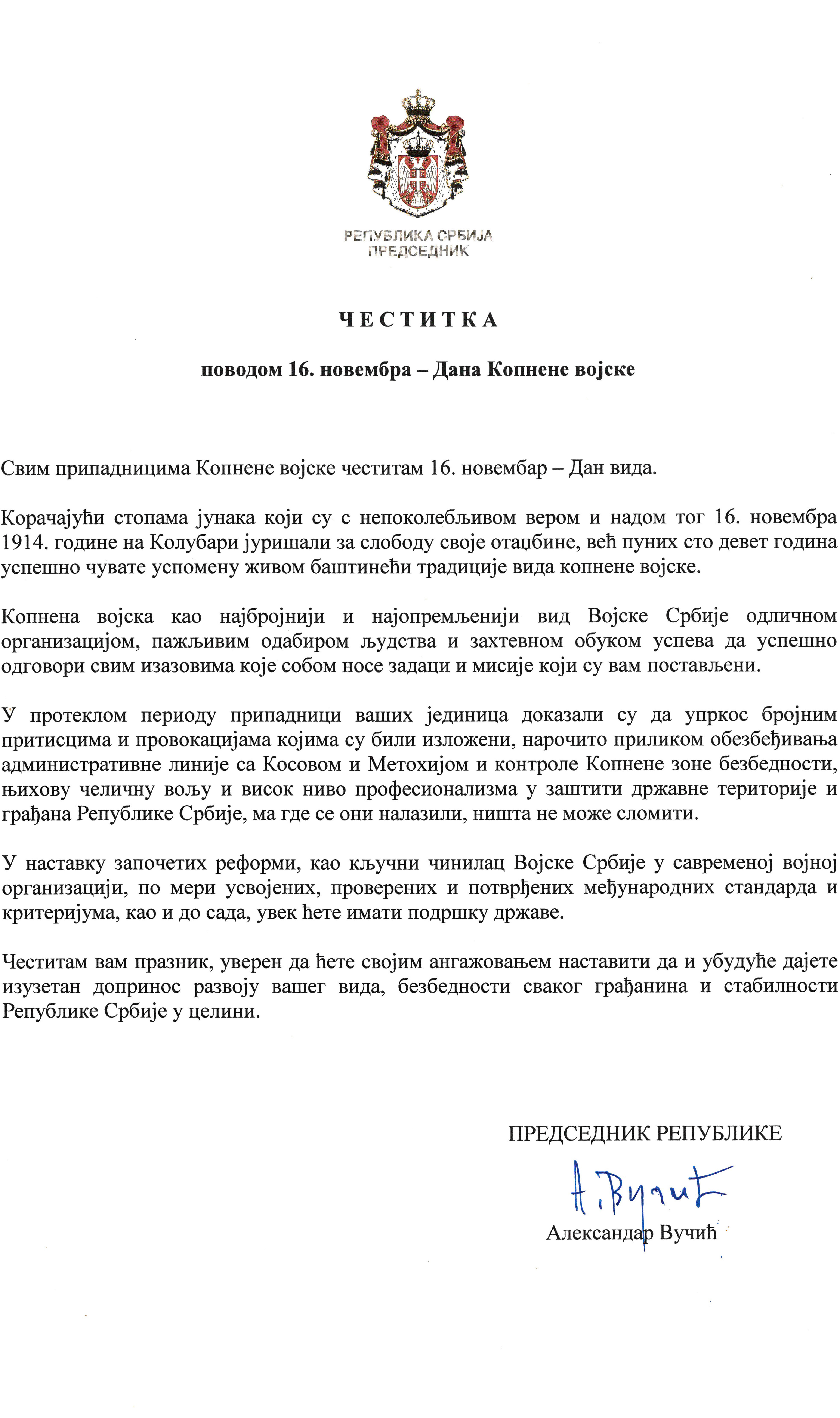 Честитка врховног команданта Војске Србије и председника Републике поводом Дана Копнене војске