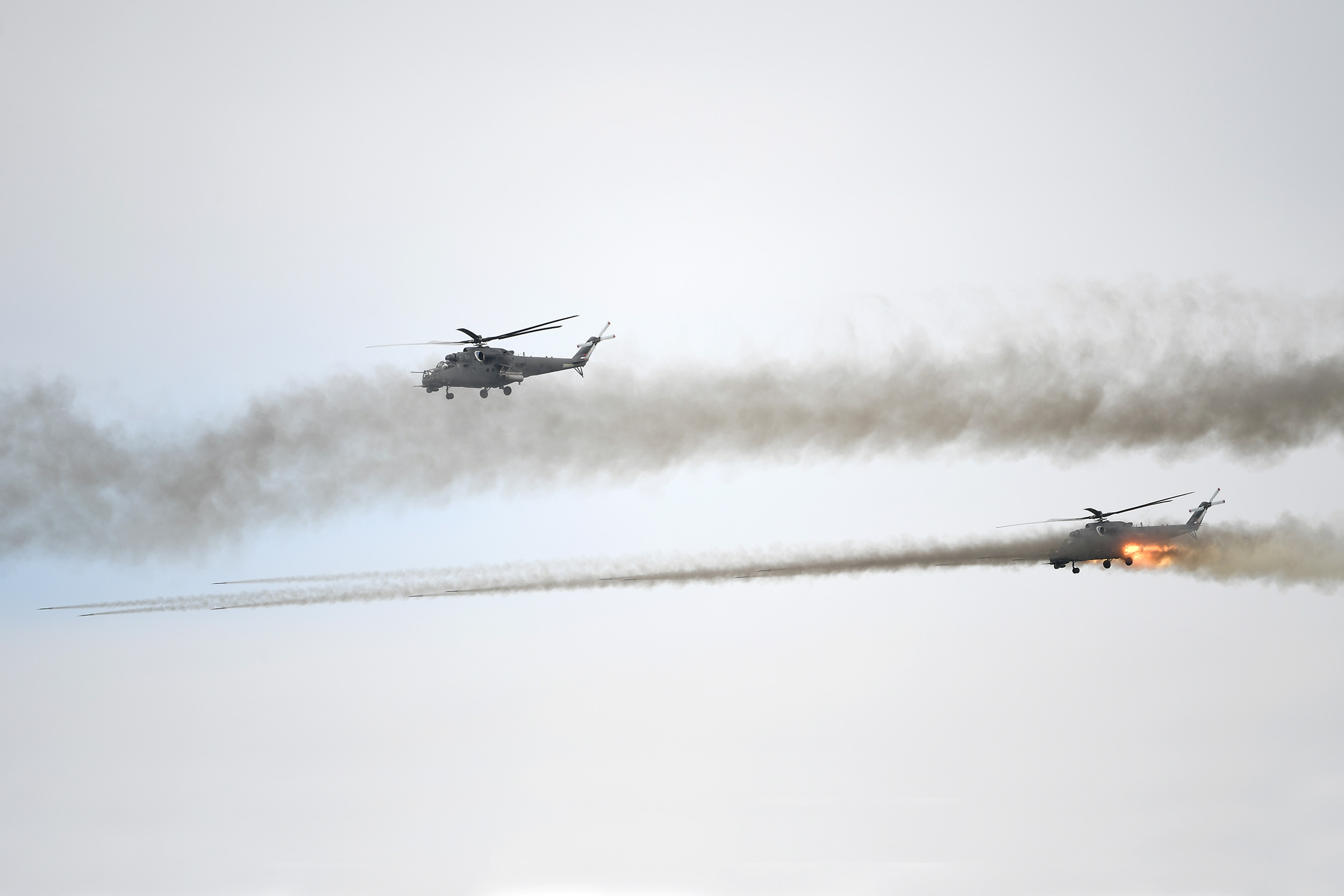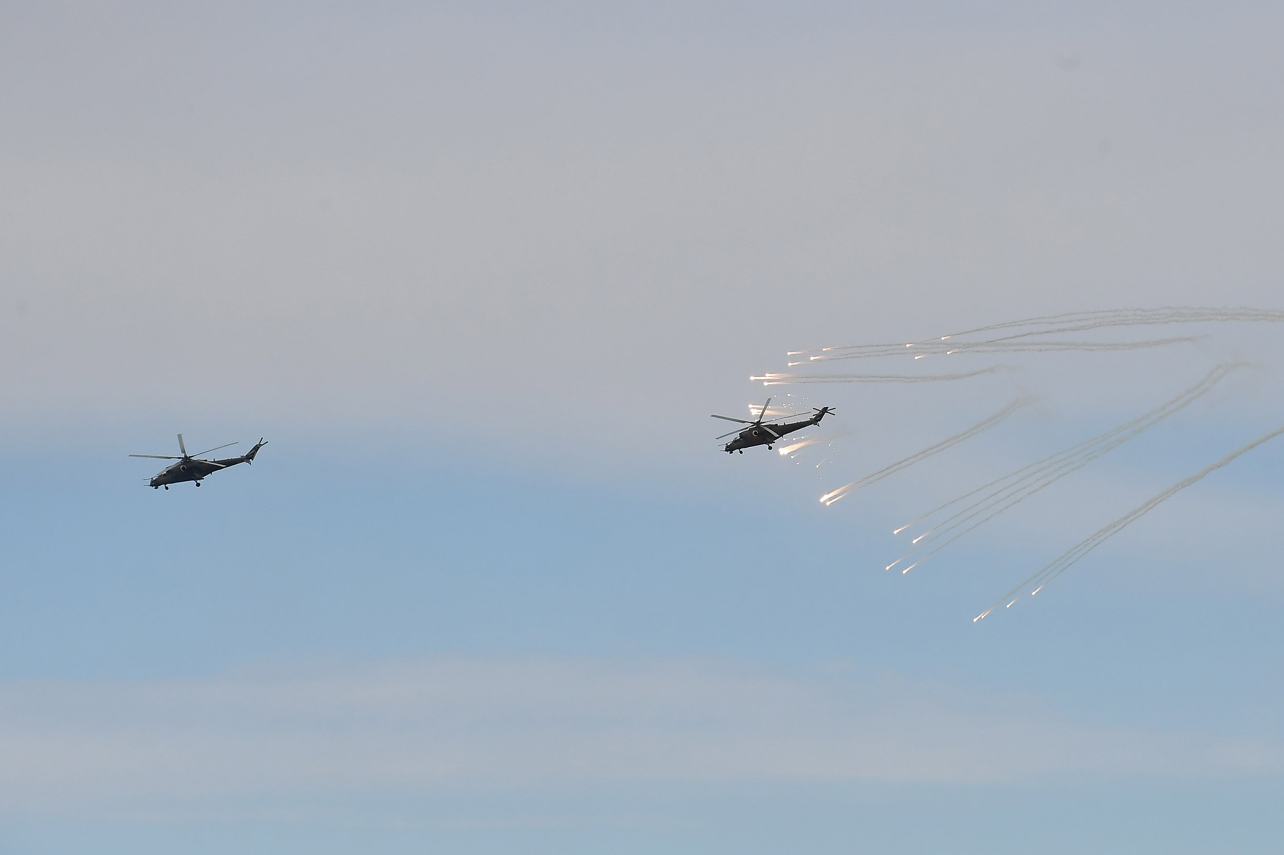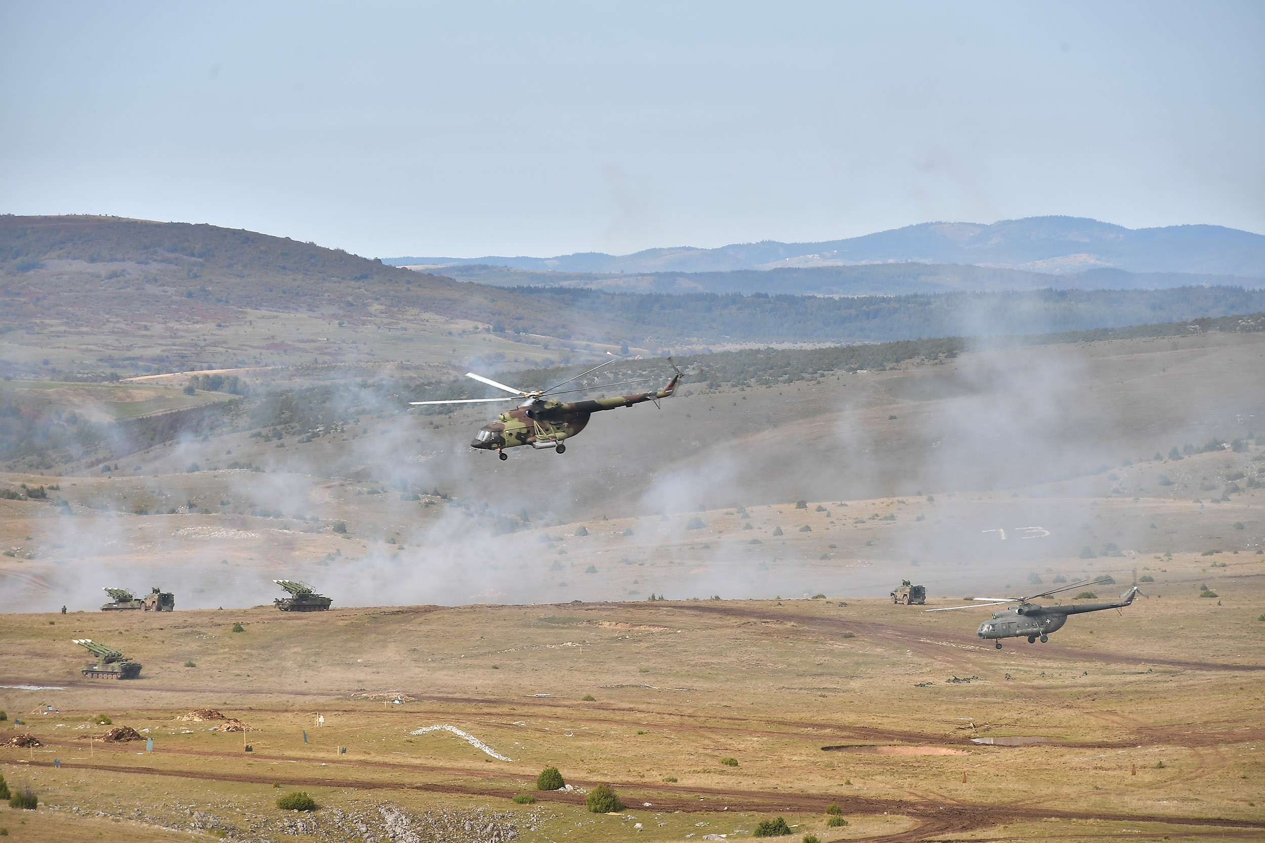 Zatim su nastupili borbeni helikopteri. Najpre naletom i dejstvom na zemaljske ciljeve borbenih helikoptera Mi-35 naoružanih radio-vođenim protiv-oklopnim raketama ATAKA. Onda su dejstvovali helikopteri Mi-17V5 naoružani nevođenim raketnim zrnima S-8, a usledio je prikriveni dolet i dejstvo helikoptera GAMA.