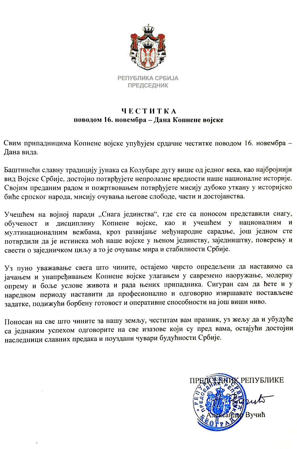 Čestitka vrhovnog komandanta Vojske Srbije i predsednika Republike povodom Dana Kopnene vojske